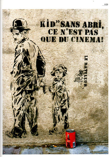 À commencer par la thématique de l’enfant des rues, le petit Poulbot, qui est sa plus grande originalité : « J’ai toujours vécu enfant des rues », ce qui correspond à une vérité de son parcours. Même idée avec le texte « les mômes de la cloche sont vos enfants », ou encore « Kid sans abri, ce n’est pas que du cinéma », que Le Bateleur illustre par une image tirée du film Le Kid, 1921, avec Charlie Chaplin devenu père de substitution d’un enfant des rues.
